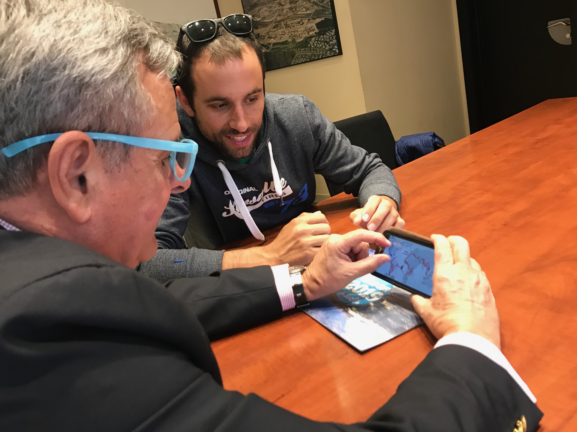El “Embajador de Majadahonda, Ciudad de la Bici” le ha mostrado a De Foxá el mapa con la ruta realizada tras haber rodado 93.000 kilómetros.