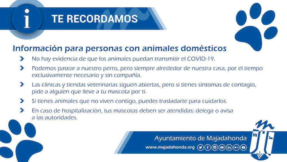El Ayuntamiento de Majadahonda ha elaborado una serie de consejos o recomendaciones a tener en cuenta si tienes mascotas o animales de compañía, siguiendo las directrices marcadas por la Federación Española de Municipios y Provincias y las medidas de seguridad de los especialistas.