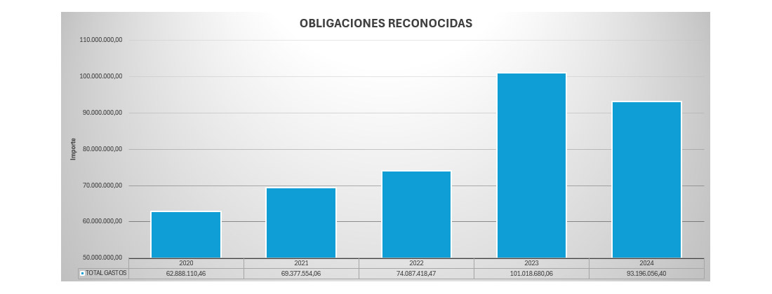 | CAPÍTULOS DE GASTOS | 2020 Obligaciones reconocidas | 2021 Obligaciones reconocidas | 2022 Obligaciones reconocidas | 2023 Obligaciones reconocidas | 2024 Obligaciones reconocidas | Variación 2024/2023 |